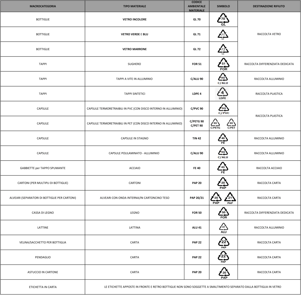 Verificate su ogni componente la sigla o il simbolo che trovate riportati nella seguente tabella per definire come smaltirlo; verificate anche la normativa del vostro Comune per assicurarvi che il tipo di materiale preveda lo smaltimento indicato in tabella a titolo generale.